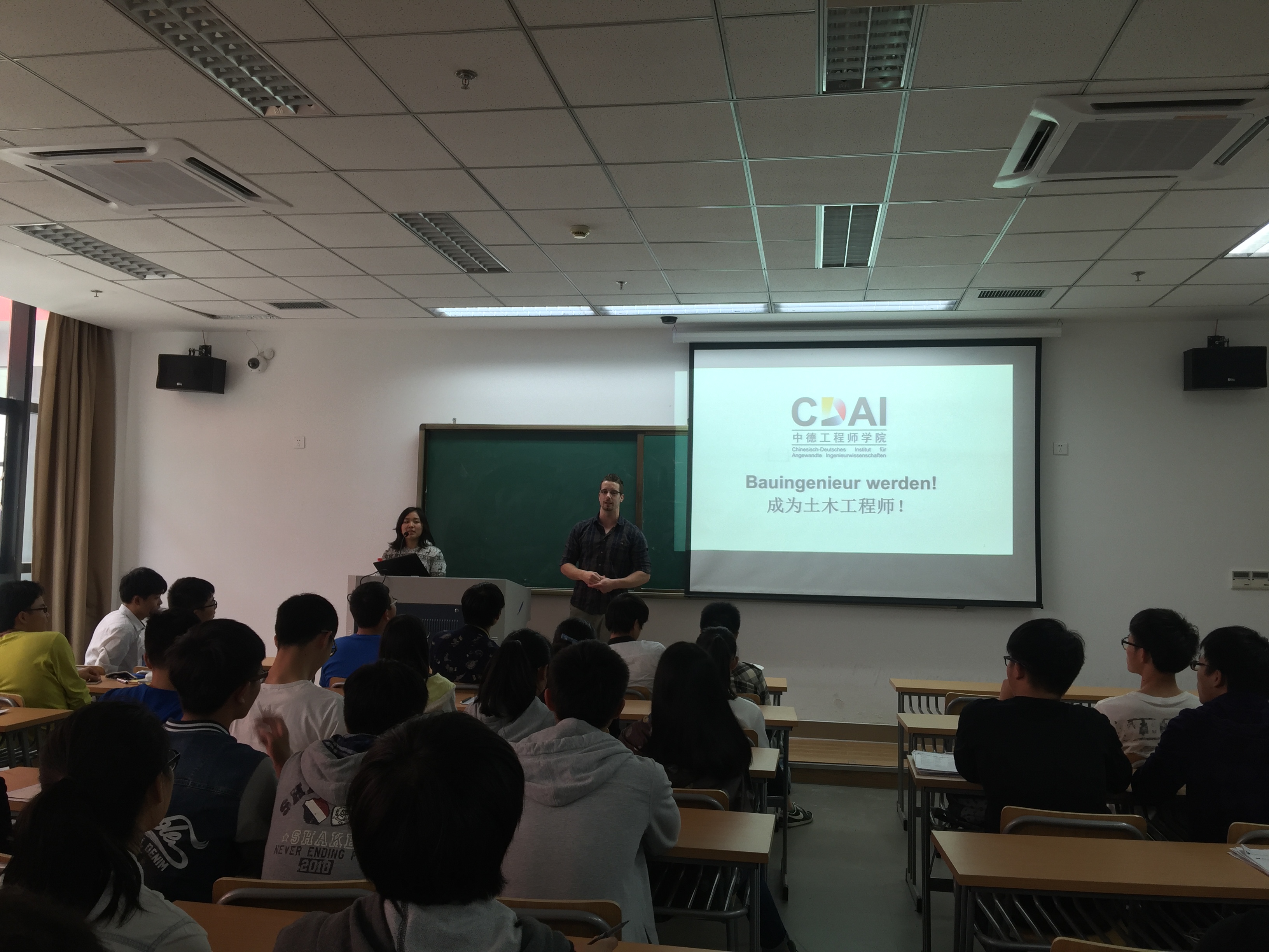 在学业安排方面,他说到CDAI学生学业构成基本分为四个部分,第一部分专业基础课、德语及思政基础;第二部分专业课,其中钢结构、流体力学两门德语授课,以及两个学期的专业德语,第三部分由德国教授全德语授课的专业课;第四部分实践学期和毕业设计。