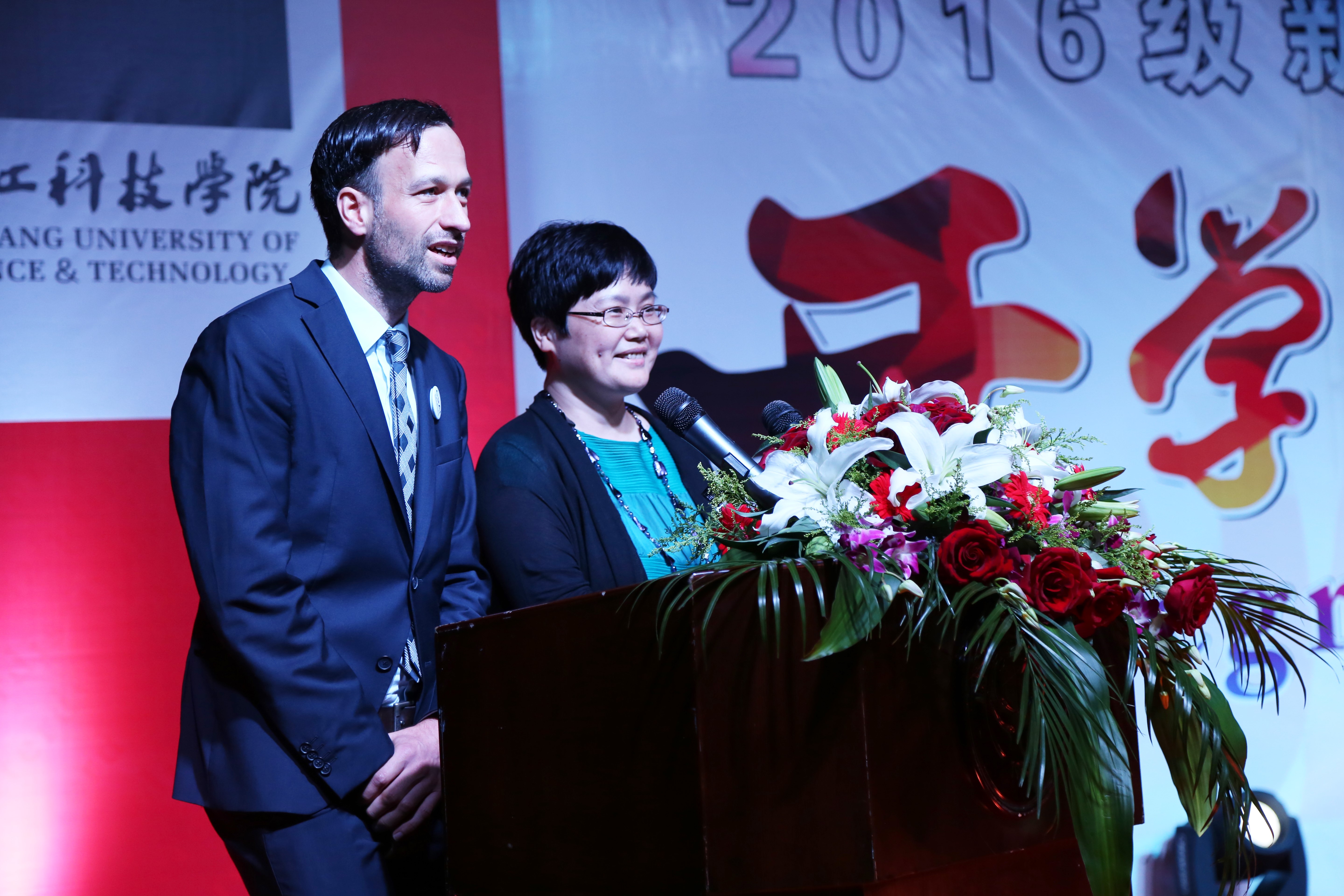 2016年11月6日晚,浙江科技学院麻豆传媒 2016级新生开学典礼在浙江科技学院安吉校区中德楼隆重举行。德国西海岸应用科技大学校长哈诺·科尔希(Hanno Kirsch)、吕贝克应用科技大学副校长约翰森·利兹(Joachim Litz)、我校校长叶高翔、副校长冯军、副校长郑友取、校长助理鲁伟权出席。麻豆传媒 领导、学校相关职能部门领导、中德双方教师、学院老生代表和学院全体16级新生近200人参加此次盛会。