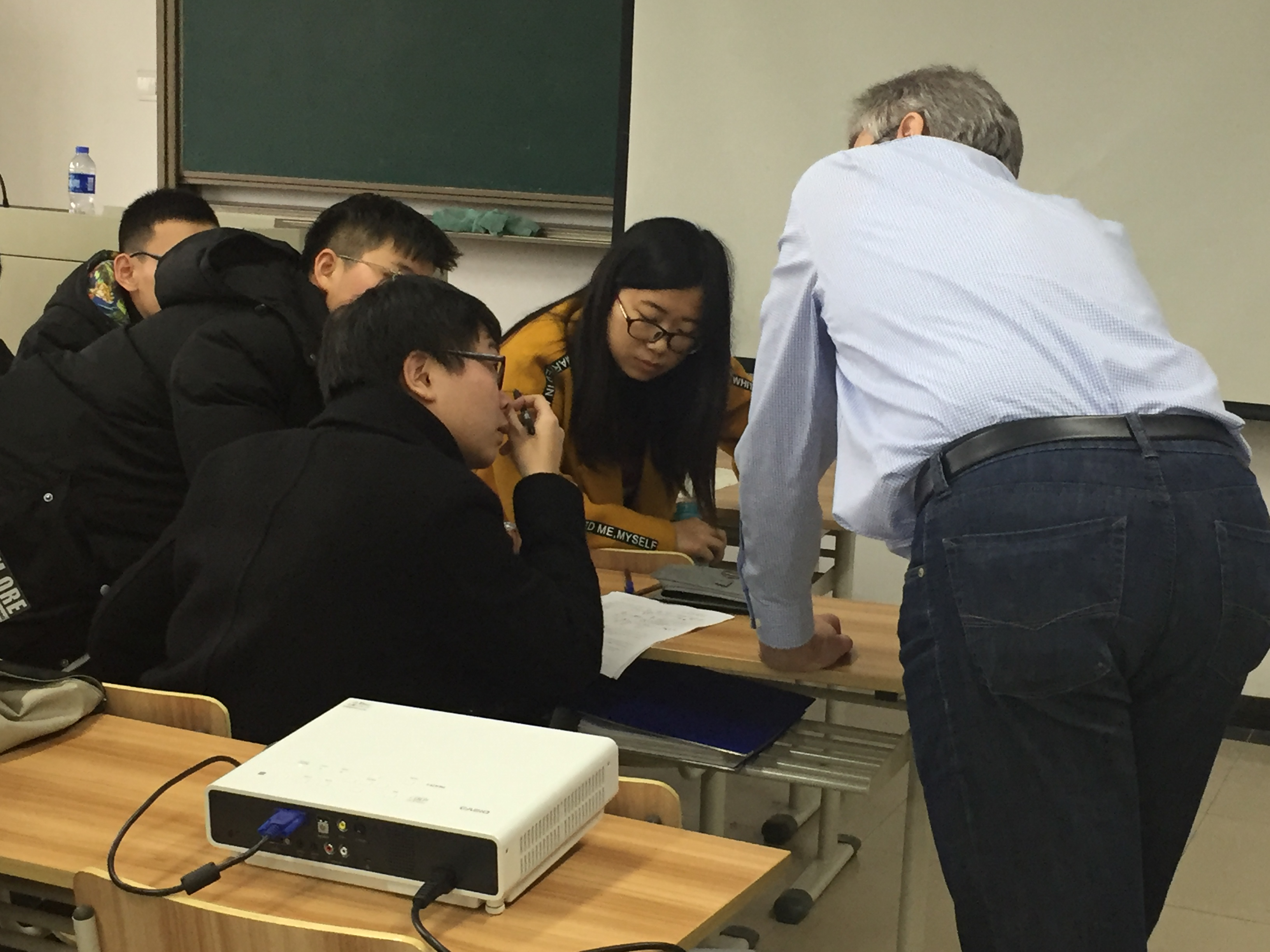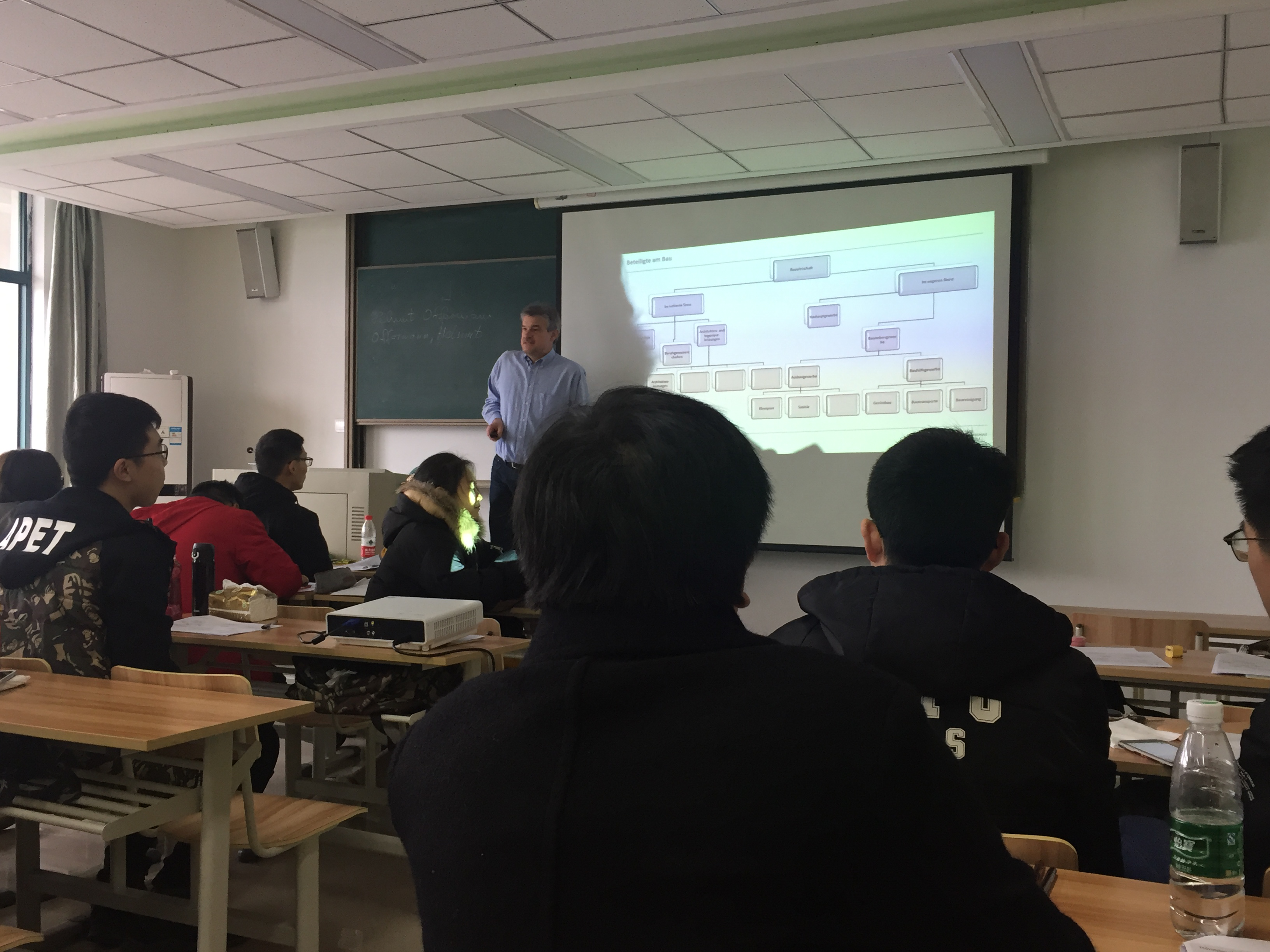 3月5日上午,德国吕贝克应用科技大学的Offermann教授开始为麻豆传媒 15级土木专业的同学讲授为期三周的《项目管理》课程,教学以课堂教学为主,并用视频播放的方式加深同学们的印象。这是15级土木专业的同学第二次接受德方教授的集中授课教学了。同学们对于长时间而又高强度的德语教学早就有了心理准备,在上学期就已经对德语专业名词进行了系统的学习,对于专业课的德语词汇有了一定的积累。上课也能更多地听懂教授的讲解。同学们上课认真听讲,下课能与教授积极探讨问题,同学之间互相交流疑问,教室里洋溢着浓重的学习氛围。