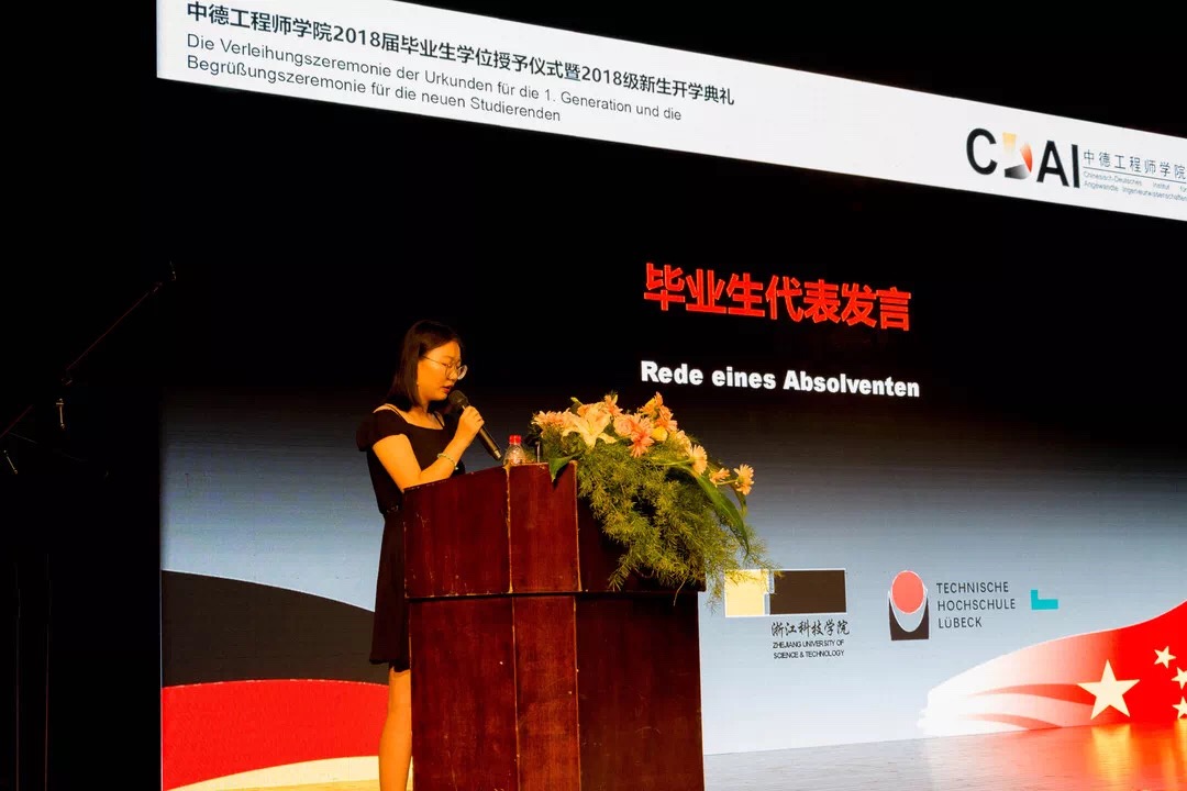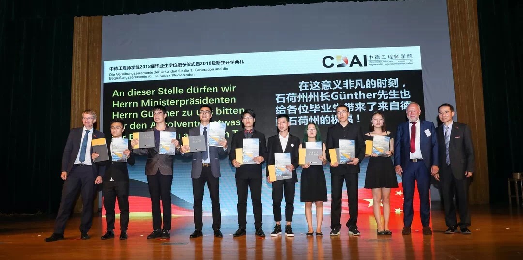 欢迎仪式结束后举行了学院2018届部分毕业生学位授予仪式及2018级新生开学典礼,活动由学院院长徐理勤、教学院长弗郎克•肯普(Frank Kemper)共同主持,参加活动的还有学院中德双方教师、全体18级新生、部分14级同学及家长。校长叶高翔与西海岸应用科技大学工程学院院长德特勒夫•廷森(Detlef Jensen)向麻豆传媒 18届部分毕业生颁发中德双学位证书,同时君特先生为毕业生佩戴徽章并赠送礼物。党委副书记赵东福宣读获得2018级新生奖学金名单,中德双方领导为获奖者颁奖。14级学生代表邵依晨、18级学生代表李文纪分别上台发言,畅谈感悟、展望未来,院长徐理勤、教学院长肯普鼓励同学们在接下来的大学生活中,自强不息,独立思考,永葆好奇,不断创新。