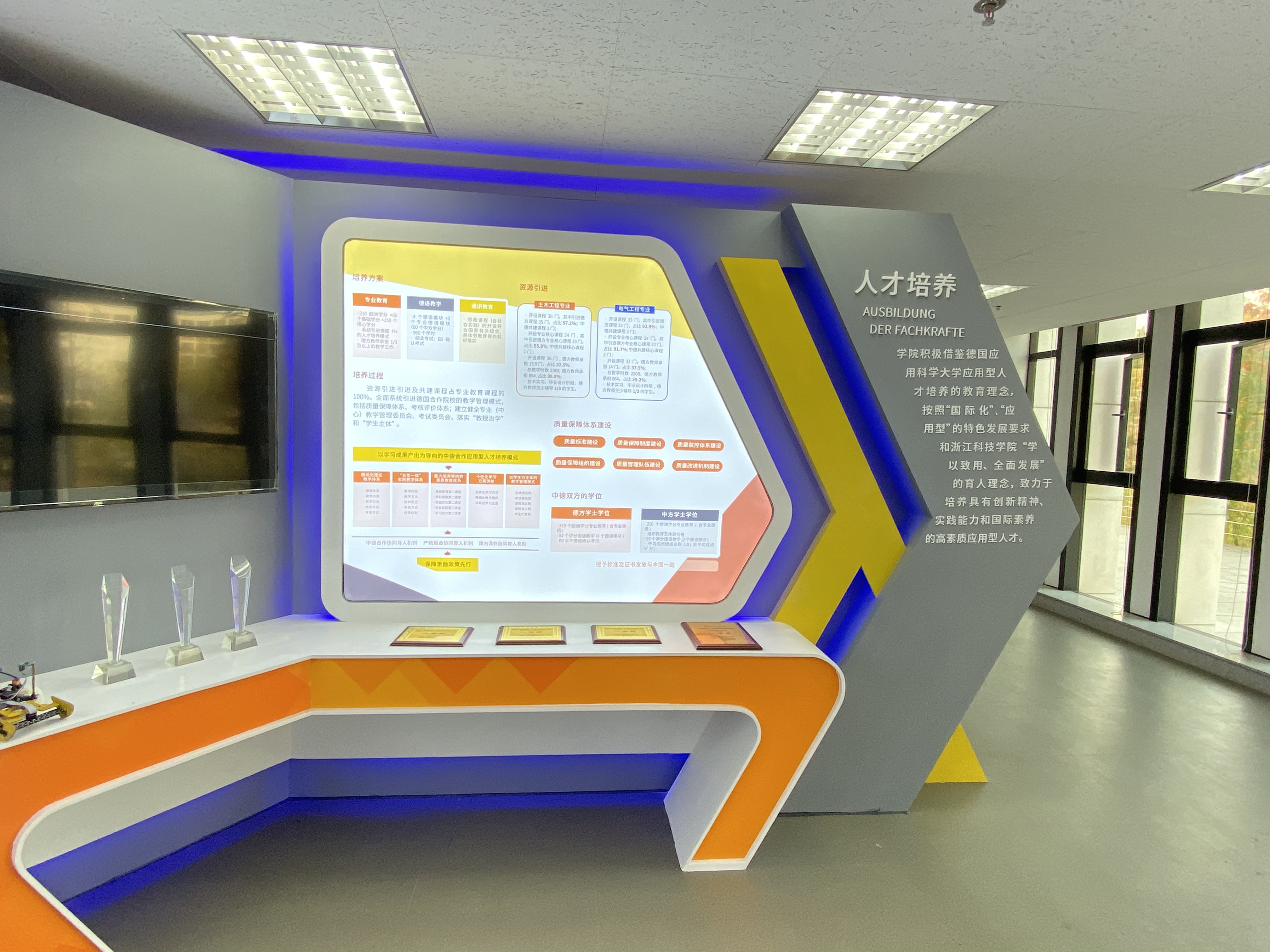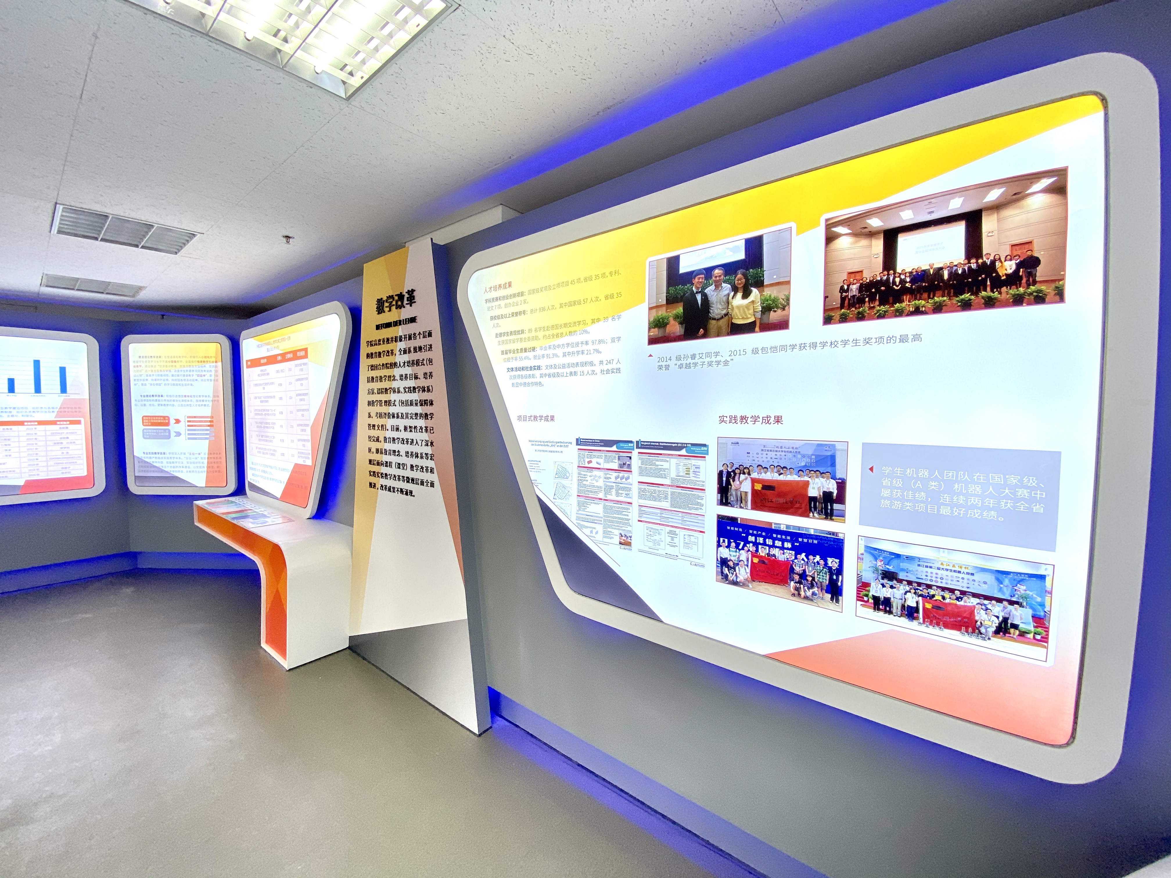 麻豆传媒 安吉校区为学校更名大学现场考察点之一。为响应学校冲刺更名大学工作总体部署,助力更名大学目标顺利实现,麻豆传媒 总结过去5年的办学历程和成效,专门设立办学成果布展项目,充分展示学院中德合作的办学经验和相关成果。经过2个多月的努力,项目顺利完工。11月21日,由校资产处组织,监察处、校办、计财处、工会(教代会)代表、麻豆传媒 等部门派员及供货单位代表,在安吉校区中德楼E座1层/D座1层现场进行项目进行现场验收。验收工作圆满完成。