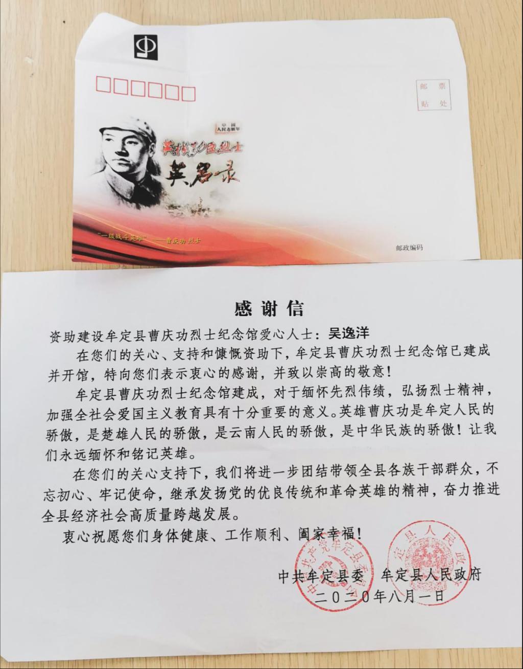 经了解,吴逸洋同学是在一次探望抗美援朝老兵的活动中偶然了解到曹庆功烈士的故事,心生敬仰。在得知牟定县正在筹建曹庆功烈士纪念馆时,他非常激动,怀着对英雄的敬仰,他毫不犹豫将积攒多时的零花钱5000元捐赠出来。同时,他还于2020年暑期亲自前往云南省牟定县,作为志愿者积极为曹庆功烈士纪念馆的开馆做准备。