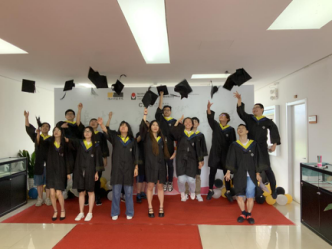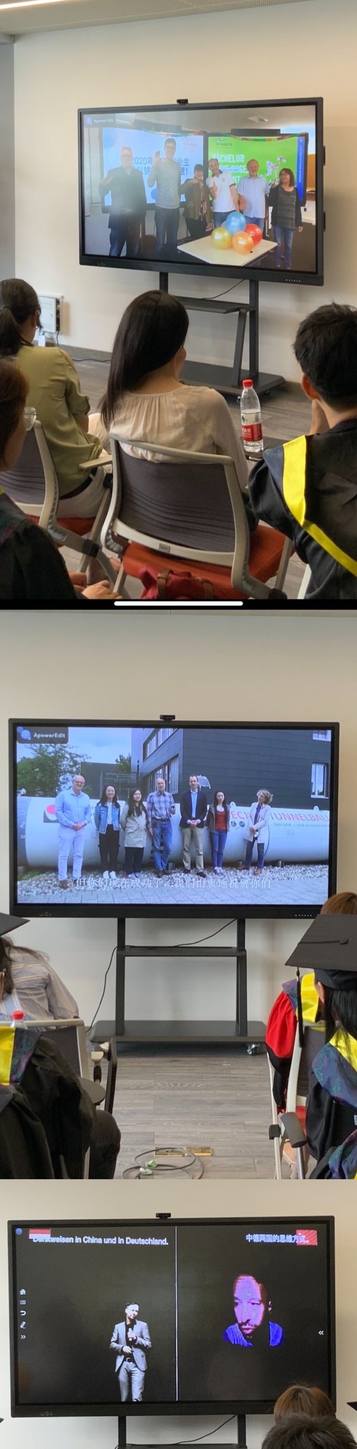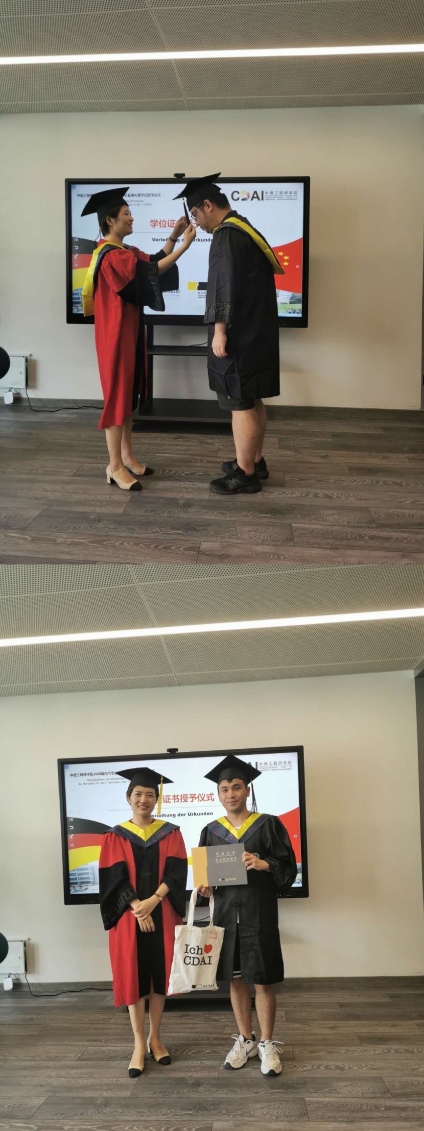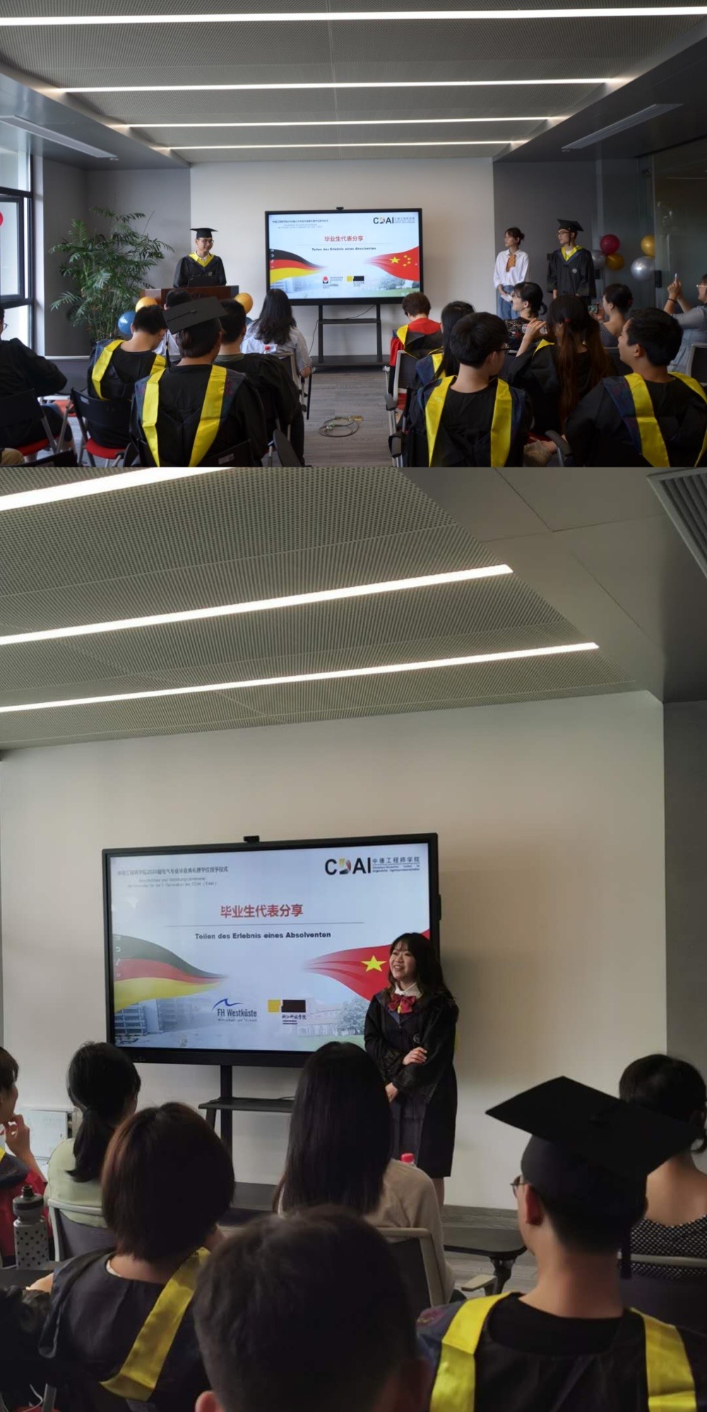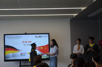 毕业典礼共三个篇章,分别为“追忆”、“荣耀”和“征程”。毕业代表们分享了个人最难忘的故事,回忆大学时期的点滴。范佳静副书记为优秀毕业生代表颁发证书和为校友联络员颁发聘书。薛文副院长身着导师服为学子们拨穗并颁发毕业证书和学位证书、校训纪念章和学院纪念品。由于疫情关系,两所合作院校的德方教师没能来到现场,但他们也通过视频向毕业生们发来了诚挚的祝福。学工负责人李成炜副书记为大家带来了最后一堂课,他回顾了四年期间的学生活动,职业规划和出国交流几个方面,从近期毕业至长期发展向同学们提出了期许。最后薛文副院长总结发言,她结合自身情况,鼓励大家离校后多学本领、长才干,用更大的正能量走好未来每一步。