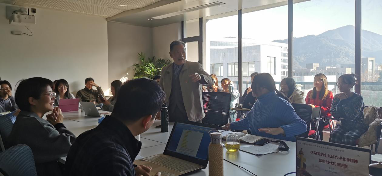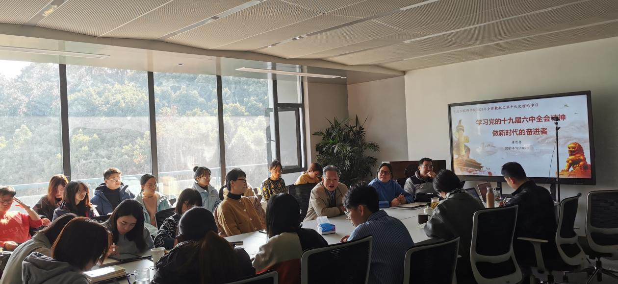 唐思鲁老师作为一名56年党龄的退休老党员,结合个人的经历,深入阐述了党的十九届六中全会的重大意义,并从《中共中央关于党的百年奋斗重大成就和历史经验的决议》的七个部分逐一进行解读。唐思鲁老师重点指出十九届六中全会明确提出的“两个确立”对党和国家的发展具有决定性意义。他引用习近平总书记的话强调,“当今世界,要说哪个政党、哪个国家、哪个民族能够自信的话,那中国共产党、中华人民共和国、中华民族是最有理由自信的。”最后,唐思鲁老师带领师生们重温《新四军军歌》,鼓励大家应牢继承和发扬党的优良传统,为党和国家的事业添砖加瓦,不断奋斗。