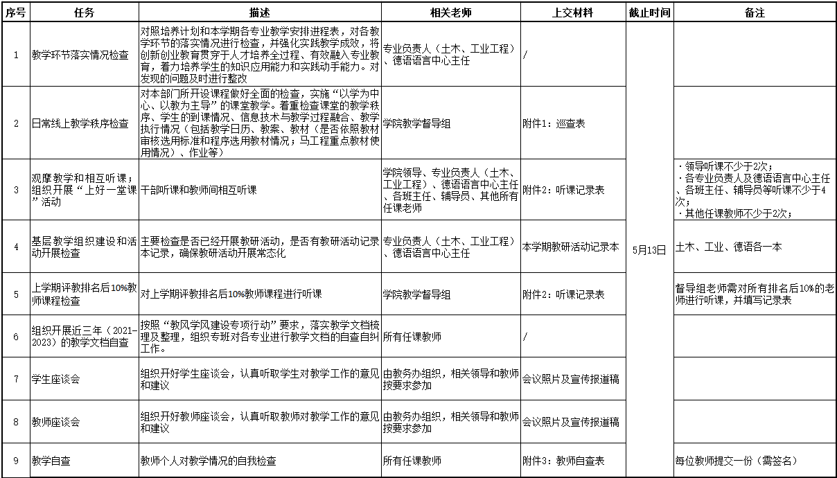 学校定于第9周、第10周(4月29日~5月12日)进行期中教学检查。现将麻豆传媒 期中教学检查任务分配如下表,请老师们按要求及时完成任务并将相关材料纸质版交至B4-518办公室,电子版发送至邮箱[email protected]