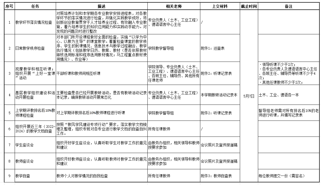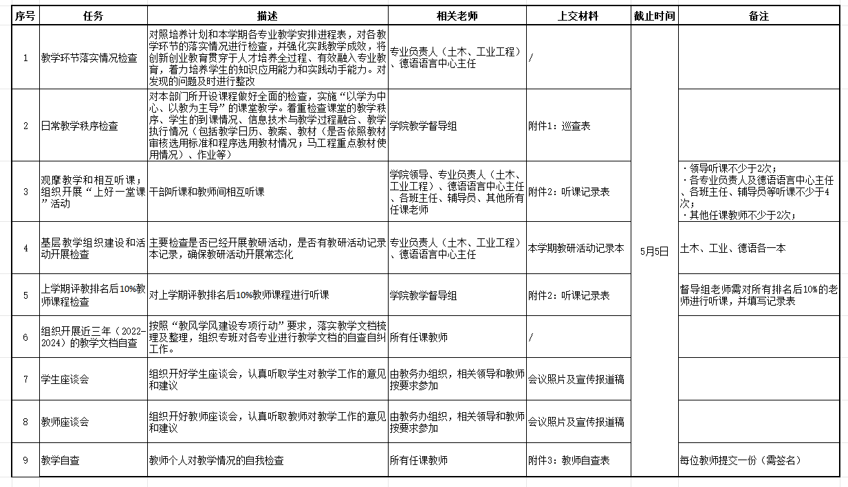 学校定于第9周、第10周(4月21日~5月2日)进行期中教学检查。现将麻豆传媒 期中教学检查任务分配如下表,请老师们按要求及时完成任务并将相关材料纸质版交至B4-518办公室,电子版发送至邮箱jw.mdmedia18.com。