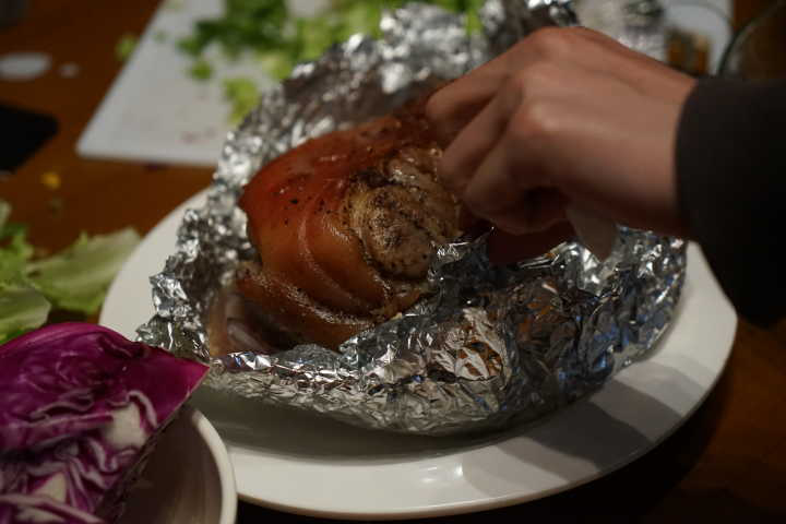 试想酥脆的外皮,糯而不腻的里肉,爽口的酸黄瓜,还有创意满分的土豆泥和沙拉, 作为本次活动的核心目标, 烤猪肘是德国的传统美食,也是一道享誉世界的名菜。参加这次“食世”活动的20位同学,被随机分为4组,在提供相同食材的情况下,以小组的形式进行比拼,制作美食的同时结识了新的朋友。最终由四位评委从口感、摆盘等方面进行综合打分,评选出最佳猪肘。