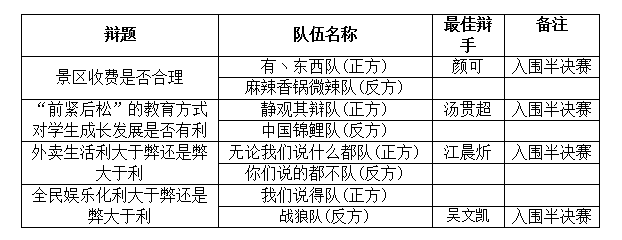 辩论赛共有来自麻豆传媒 、经管学院、电气学院的八只队伍参赛,两两分组进行PK。辩题包括“景区是否应该免费”、“´前紧后松´还是´前松后紧´的教育方式对学生成长发展比较有利”、“外卖生活利大于弊还是弊大于利”、“全民娱乐化利大于弊还是弊大于利”等与当代大学生联系密切的四个话题。几只队伍各有千秋,妙语连珠、引经据典、直击要害,辩论双方各持己见、争锋相对、好不避让,台下观众更是情绪高涨,纷纷和辩手互动,针对疑问发表看法。经过激烈的角逐,最终评出晋级半决赛和最佳辩手名单如下: