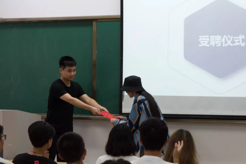 学生会主席杨晨为新上任的部长颁发聘书