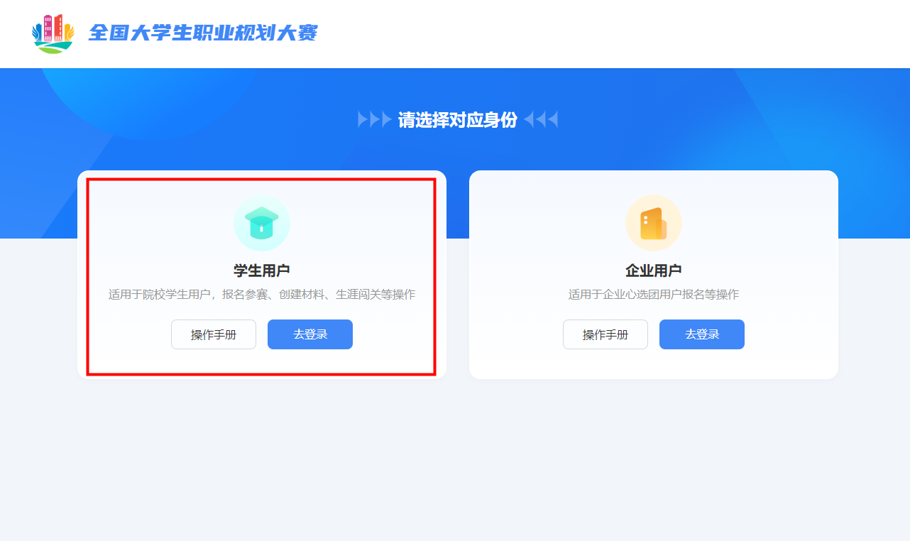 参赛选手平台主页 -登录-选择学生用户身份-使用学信网账号登录。